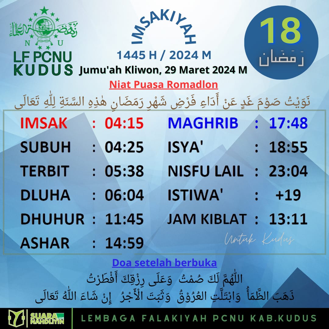 Ramadan Jadwal Imsakiyah untuk Kudus dan Sekitarnya, 18 Ramadan 1445 H 28 March 2024 0 591 Share on Facebook Tweet on Twitter Comments Share this:Click to share on WhatsApp (Opens in new window)Click to share on Facebook (Opens in new window)Click to share on Twitter (Opens in new window)Click to share on Telegram (Opens in new window) Related