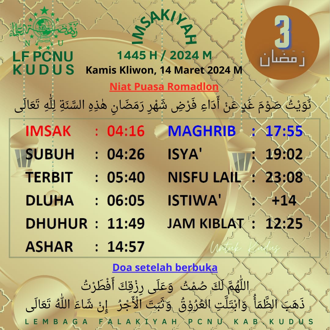 Ramadan Jadwal Imsakiyah untuk Kudus dan sekitarnya, 3 Ramadan 1445 H 13 March 2024 0 714 Share on Facebook Tweet on Twitter Comments Share this:Click to share on WhatsApp (Opens in new window)Click to share on Facebook (Opens in new window)Click to share on Twitter (Opens in new window)Click to share on Telegram (Opens in new window) Related