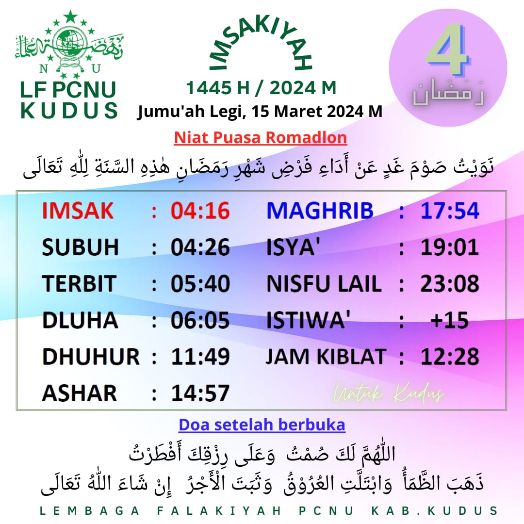 Ramadan Jadwal Imsakiyah untuk Kudus dan sekitarnya, 4 Ramadan 1445 H 14 March 2024 0 1503 Share on Facebook Tweet on Twitter Comments Share this:Click to share on WhatsApp (Opens in new window)Click to share on Facebook (Opens in new window)Click to share on Twitter (Opens in new window)Click to share on Telegram (Opens in new window) Related