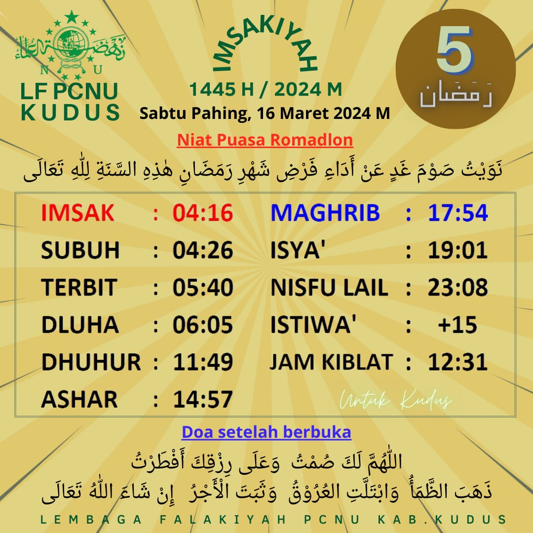 Ramadan Jadwal Imsakiyah untuk Kudus dan sekitarnya, 5 Ramadan 1445 H 15 March 2024 0 1147 Share on Facebook Tweet on Twitter Comments Share this:Click to share on WhatsApp (Opens in new window)Click to share on Facebook (Opens in new window)Click to share on Twitter (Opens in new window)Click to share on Telegram (Opens in new window) Related