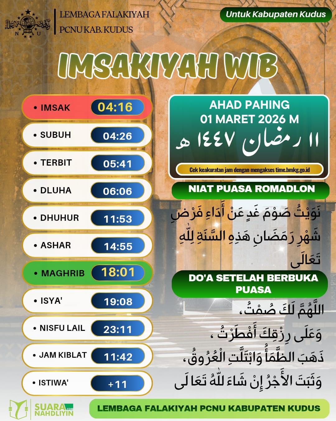 Ramadan Jadwal Imsakiyah untuk Wilayah Kudus, 11 Ramadan 1447 H 28 February 2026 0 59 Share on Facebook Tweet on Twitter KUDUS, Suaranahdliyin.com – Jadwal Imsakiyah untuk Wilayah Kudus, 11 Ramadan 1447 H/ 1 Maret 2026. Sumber: LFNU Kabupaten Kudus Comments Share this:Click to share on WhatsApp (Opens in new window)Click to share on Facebook (Opens in new window)Click to share on Twitter (Opens in new window)Click to share on Telegram (Opens in new window) Related