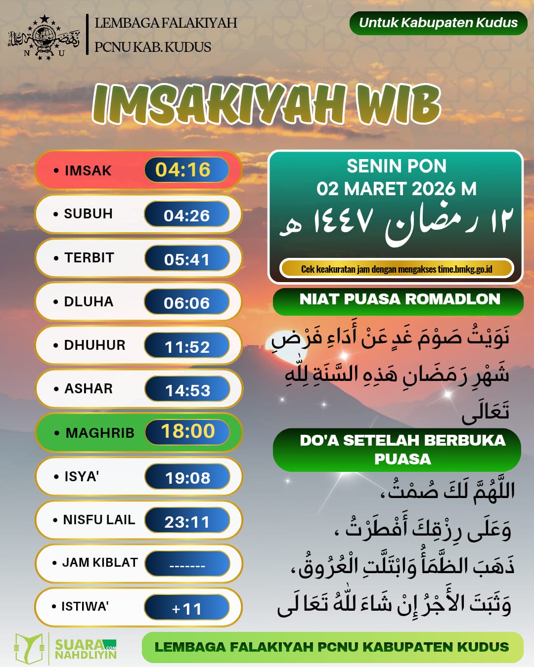Ramadan Jadwal Imsakiyah untuk Wilayah Kudus, 12 Ramadan 1447 H 1 March 2026 0 66 Share on Facebook Tweet on Twitter KUDUS, Suranahdliyin.com – Buat umat Islam di Kabupaten Kudus, berikut jadwal imsakiyah untuk Wilayah Kabupaten Kudus, 12 Ramadan 1447 H/ 2 Maret 2026. Sumber: LFNU Kudus Comments Share this:Click to share on WhatsApp (Opens in new window)Click to share on Facebook (Opens in new window)Click to share on Twitter (Opens in new window)Click to share on Telegram (Opens in new window) Related