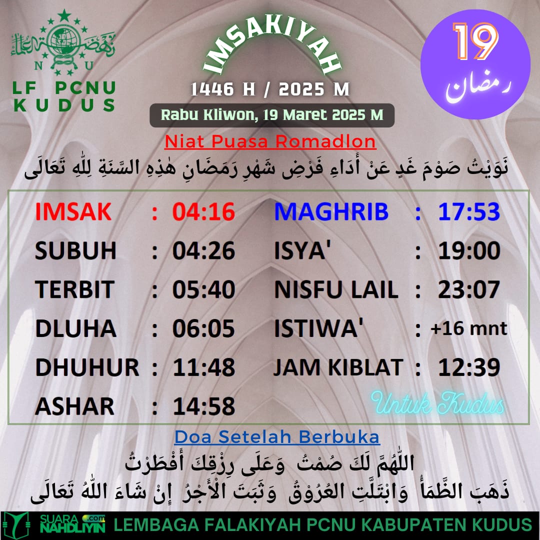 Ramadan Jadwal Imsakiyah untuk Wilayah Kudus, 19 Ramadan 1446 H 18 March 2025 0 377 Share on Facebook Tweet on Twitter Comments Share this:Click to share on WhatsApp (Opens in new window)Click to share on Facebook (Opens in new window)Click to share on Twitter (Opens in new window)Click to share on Telegram (Opens in new window) Related