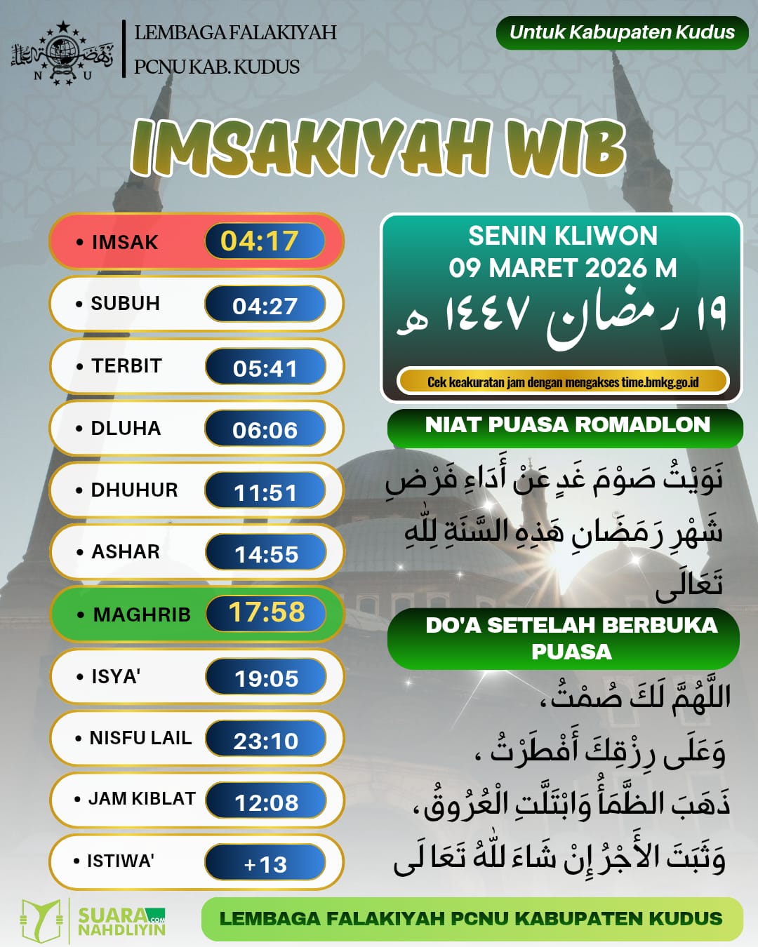 Ramadan Jadwal Imsakiyah untuk Wilayah Kudus, 19 Ramadan 1447 H 8 March 2026 0 129 Share on Facebook Tweet on Twitter KUDUS, Suaranahdliyin.com – Jadwal Imsakiyah untuk Wilayah Kudus, 19 Ramadan 1447 H/ 9 Maret 2026. Sumber: LFNU Kabupaten Kudus Comments Share this:Click to share on WhatsApp (Opens in new window)Click to share on Facebook (Opens in new window)Click to share on Twitter (Opens in new window)Click to share on Telegram (Opens in new window) Related