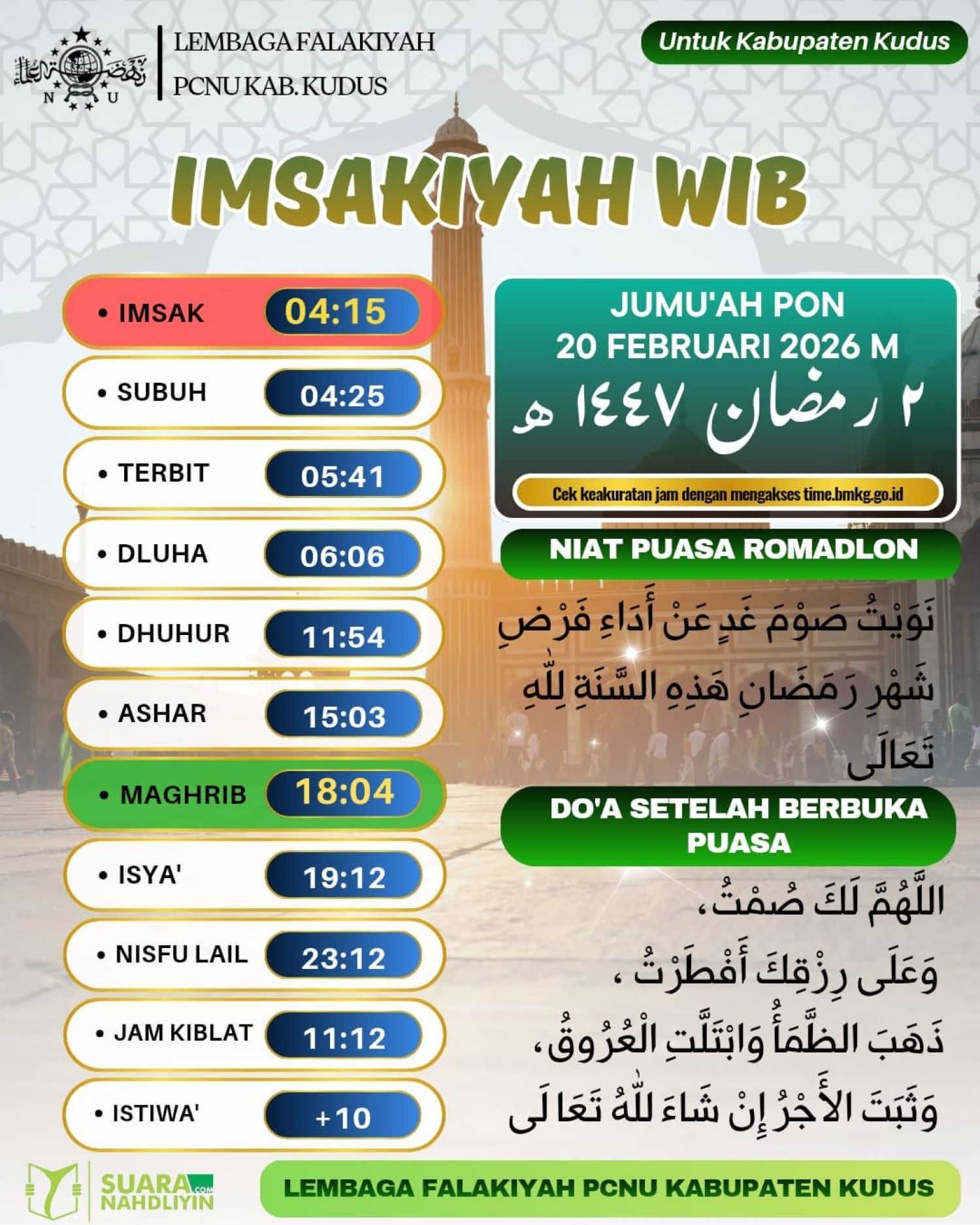 Ramadan Jadwal Imsakiyah untuk Wilayah Kudus, 2 Ramadan 1447 H 19 February 2026 0 41 Share on Facebook Tweet on Twitter KUDUS, Suaranahdliyin.com – Jadwal Imsakiyah untuk Wilayah Kudus, 2 Ramadan 1447 H/ 20 Februari 2026. Sumber: LFNU Kabupaten Kudus Comments Share this:Click to share on WhatsApp (Opens in new window)Click to share on Facebook (Opens in new window)Click to share on Twitter (Opens in new window)Click to share on Telegram (Opens in new window) Related