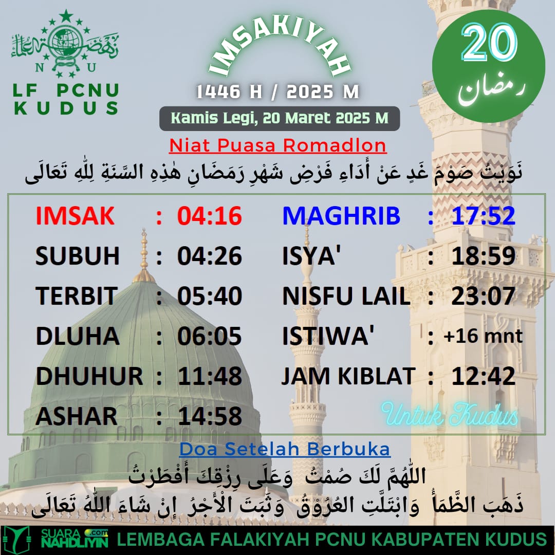 Ramadan Jadwal Imsakiyah untuk Wilayah Kudus, 20 Ramadan 1446 H 19 March 2025 0 479 Share on Facebook Tweet on Twitter Comments Share this:Click to share on WhatsApp (Opens in new window)Click to share on Facebook (Opens in new window)Click to share on Twitter (Opens in new window)Click to share on Telegram (Opens in new window) Related