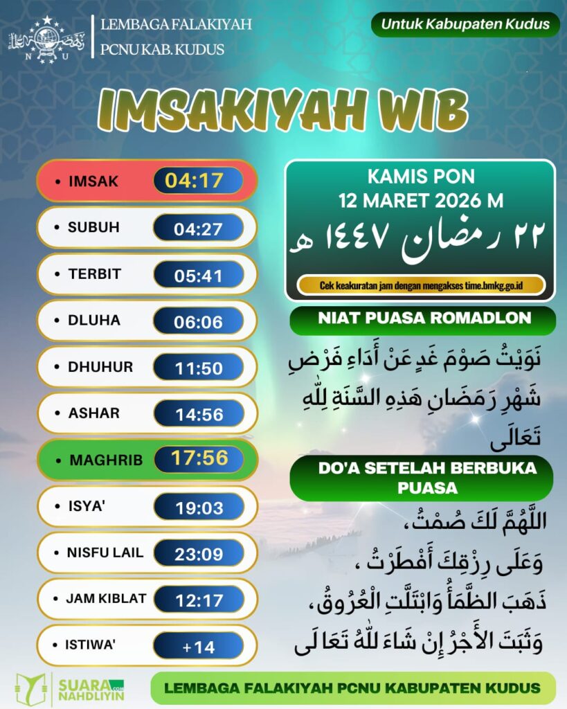 Ramadan Jadwal Imsakiyah untuk Wilayah Kudus, 22 Ramadan 1447 H 11 March 2026 0 34 Share on Facebook Tweet on Twitter KUDUS, Suaranahdliyin.com – Informasi untuk umat Islam di Kabupaten Kudus, berikut jadwal imsakiyah untuk Wilayah Kabupaten Kudus, 22 Ramadan 1447 H/ 12 Maret 2026. Sumber: LFNU Kabupaten Kudus Kudus Comments Share this:Click to share on WhatsApp (Opens in new window)Click to share on Facebook (Opens in new window)Click to share on Twitter (Opens in new window)Click to share on Telegram (Opens in new window) Related