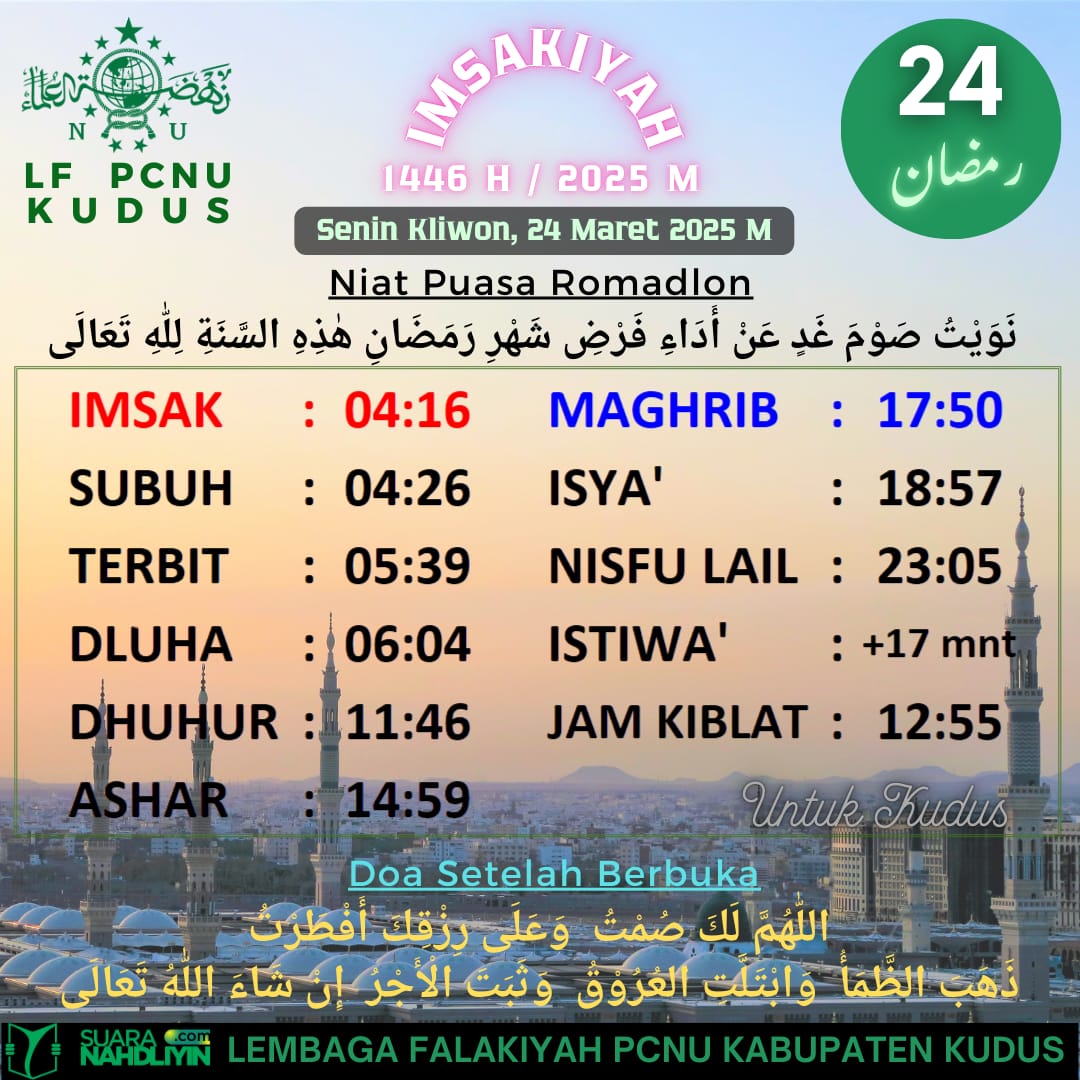 Ramadan Jadwal Imsakiyah untuk Wilayah Kudus, 24 Ramadan 1446 H 23 March 2025 0 543 Share on Facebook Tweet on Twitter Comments Share this:Click to share on WhatsApp (Opens in new window)Click to share on Facebook (Opens in new window)Click to share on Twitter (Opens in new window)Click to share on Telegram (Opens in new window) Related