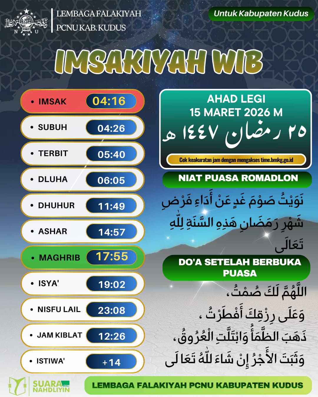 Ramadan Jadwal Imsakiyah untuk Wilayah Kudus, 25 Ramadan 1447 H 14 March 2026 0 36 Share on Facebook Tweet on Twitter KUDUS, Suaranahdliyin.com – Buat umat Islam di Kabupaten Kudus dan sekitarnya, berikut jadwal imsakiyah untuk Wilayah Kabupaten Kudus, 25 Ramadan 1447 H/ 15 Maret 2026. Sumber: LFNU Kabupaten Kudus Comments Share this:Click to share on WhatsApp (Opens in new window)Click to share on Facebook (Opens in new window)Click to share on Twitter (Opens in new window)Click to share on Telegram (Opens in new window) Related