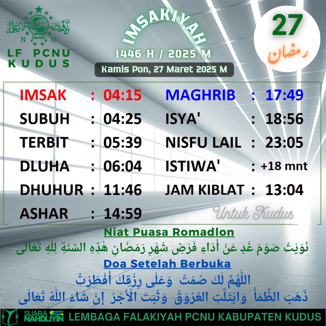Ramadan Jadwal Imsakiyah untuk Wilayah Kudus, 27 Ramadan 1446 H 26 March 2025 0 548 Share on Facebook Tweet on Twitter Comments Share this:Click to share on WhatsApp (Opens in new window)Click to share on Facebook (Opens in new window)Click to share on Twitter (Opens in new window)Click to share on Telegram (Opens in new window) Related