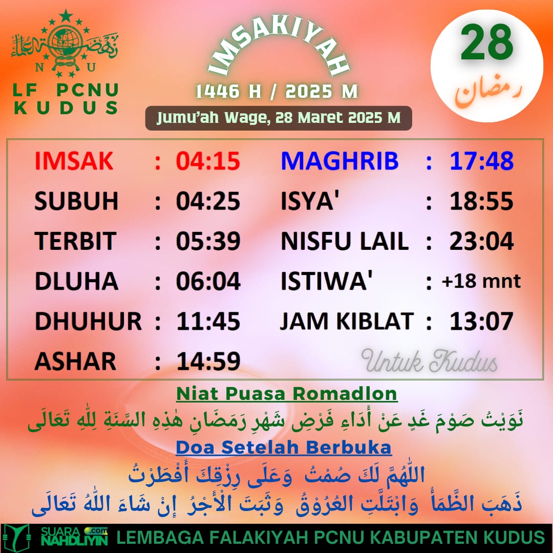 Ramadan Jadwal Imsakiyah untuk Wilayah Kudus, 28 Ramadan 1446 H 27 March 2025 0 364 Share on Facebook Tweet on Twitter Comments Share this:Click to share on WhatsApp (Opens in new window)Click to share on Facebook (Opens in new window)Click to share on Twitter (Opens in new window)Click to share on Telegram (Opens in new window) Related