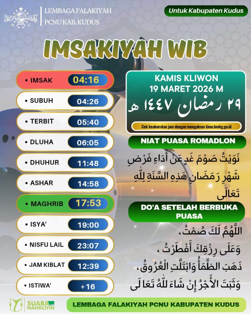 KUDUS, Suaranahdliyin.com – Buat umat Islam di Kabupaten Kudus dan sekitarnya, berikut jadwal imsakiyah untuk Wilayah Kabupaten Kudus, 29 Ramadan 1447 H/ 19 Maret 2026.