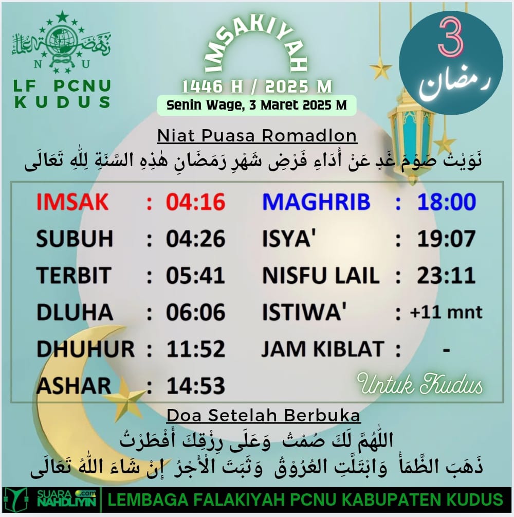 Ramadan Jadwal Imsakiyah untuk Wilayah Kudus, 3 Ramadan 1446 H 2 March 2025 0 698 Share on Facebook Tweet on Twitter Comments Share this:Click to share on WhatsApp (Opens in new window)Click to share on Facebook (Opens in new window)Click to share on Twitter (Opens in new window)Click to share on Telegram (Opens in new window) Related