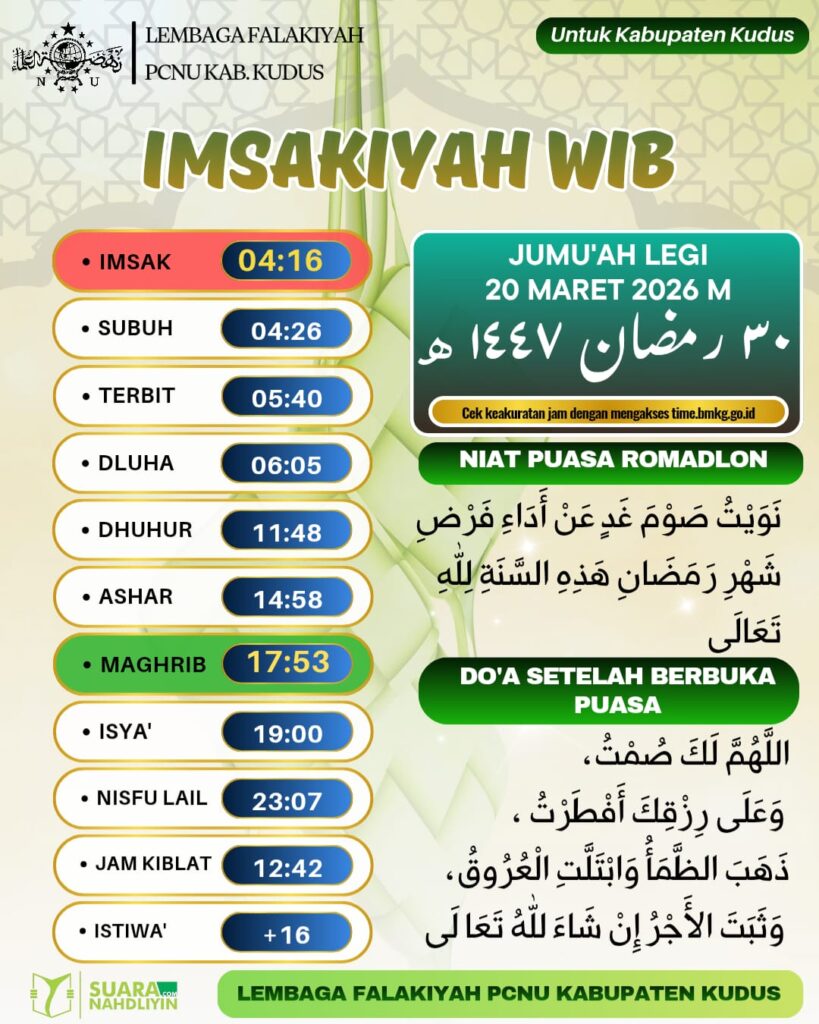 Ramadan Jadwal Imsakiyah untuk Wilayah Kudus, 30 Ramadan 1447 H 19 March 2026 0 40 Share on Facebook Tweet on Twitter KUDUS, Suaranahdliyin.com – Buat umat Islam di Kabupaten Kudus dan sekitarnya, berikut jadwal imsakiyah untuk Wilayah Kabupaten Kudus, 30 Ramadan 1447 H/ 20 Maret 2026. Sumber: LFNU Kabupaten Kudus Comments Share this:Click to share on WhatsApp (Opens in new window)Click to share on Facebook (Opens in new window)Click to share on Twitter (Opens in new window)Click to share on Telegram (Opens in new window) Related
