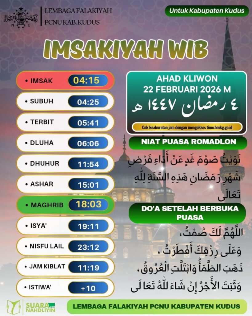 Ramadan Jadwal Imsakiyah untuk Wilayah Kudus, 4 Ramadan 1447 H 21 February 2026 0 61 Share on Facebook Tweet on Twitter KUDUS, Suaranahdliyin.com – Jadwal Imsakiyah untuk Wilayah Kudus, 4 Ramadan 1447 H/ 22 Februari 2026. Sumber: LFNU Kabupaten Kudus Comments Share this:Click to share on WhatsApp (Opens in new window)Click to share on Facebook (Opens in new window)Click to share on Twitter (Opens in new window)Click to share on Telegram (Opens in new window) Related