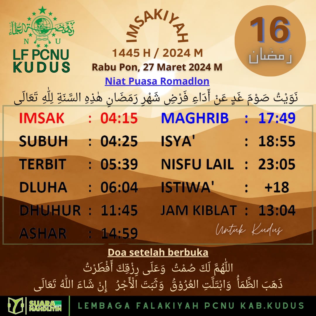 Berita Jadwal Imsakiyah untuk Wilayah Kudus dan Sekitarnya, 16 Ramadan 1445 H 26 March 2024 0 981 Share on Facebook Tweet on Twitter Comments Share this:Click to share on WhatsApp (Opens in new window)Click to share on Facebook (Opens in new window)Click to share on Twitter (Opens in new window)Click to share on Telegram (Opens in new window) Related