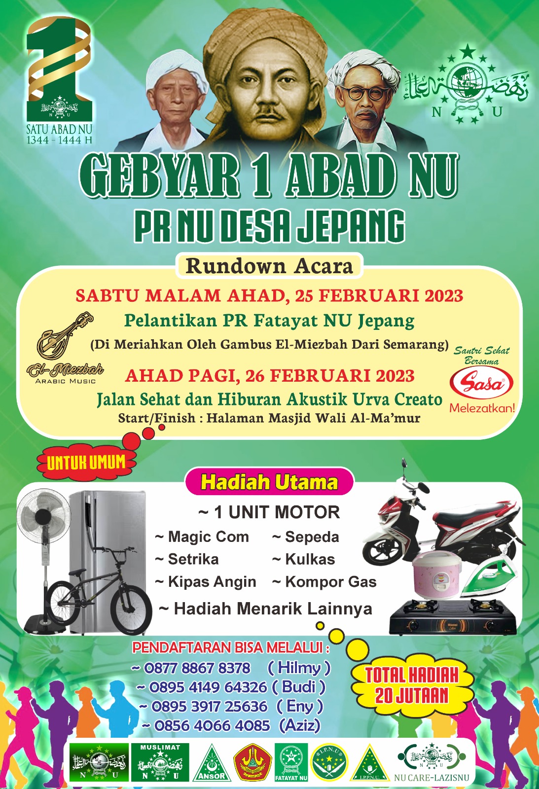 KUDUS, Suaranahdliyin.com – Pengurus Ranting Nahdlatul Ulama (PRNU) Jepang, Kecamatan Mejobo, Kabupaten Kudus akan menyelenggarakan peringatan 1 Abad Nahdlatul Ulama (NU) pada 25 – 26 Februari mendatang.
