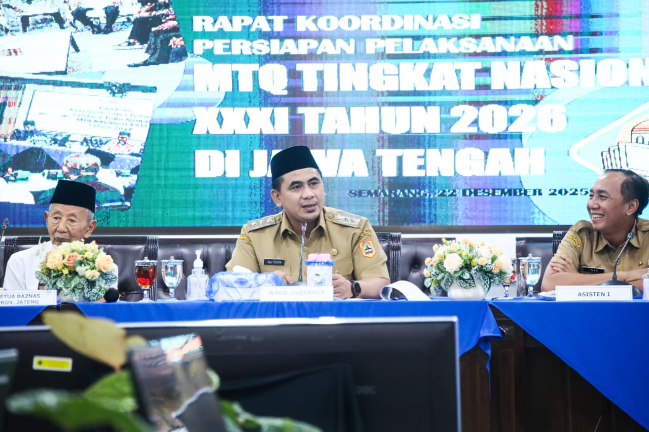 Hal itu disampaikan Gus Yasin, sapaan akrabnya, saat memimpin Rapat Koordinasi Persiapan Pelaksanaan MTQ Tingkat Nasional XXXI (ke-31) Tahun 2026 di Jawa Tengah, di komplek gubernuran Semarang, Senin, (22/12/2025).