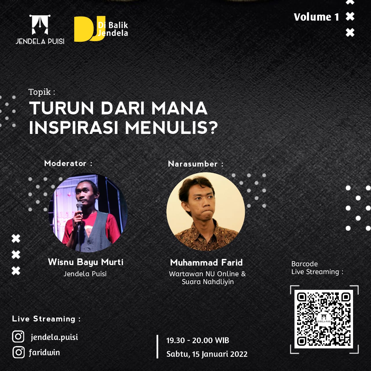 KUDUS, Suaranahdliyin.com – Bicara tentang literasi dan kepenulisan, Komunitas Jendela Puisi mengadakan ngobrol santai bersama Redaktur Suara Nahdliyin Muhammad Farid bertema “Turun Dari Mana Inspirasi Menulis?” secara live di Instagram @jendela.puisi, Sabtu (15/01/2022).