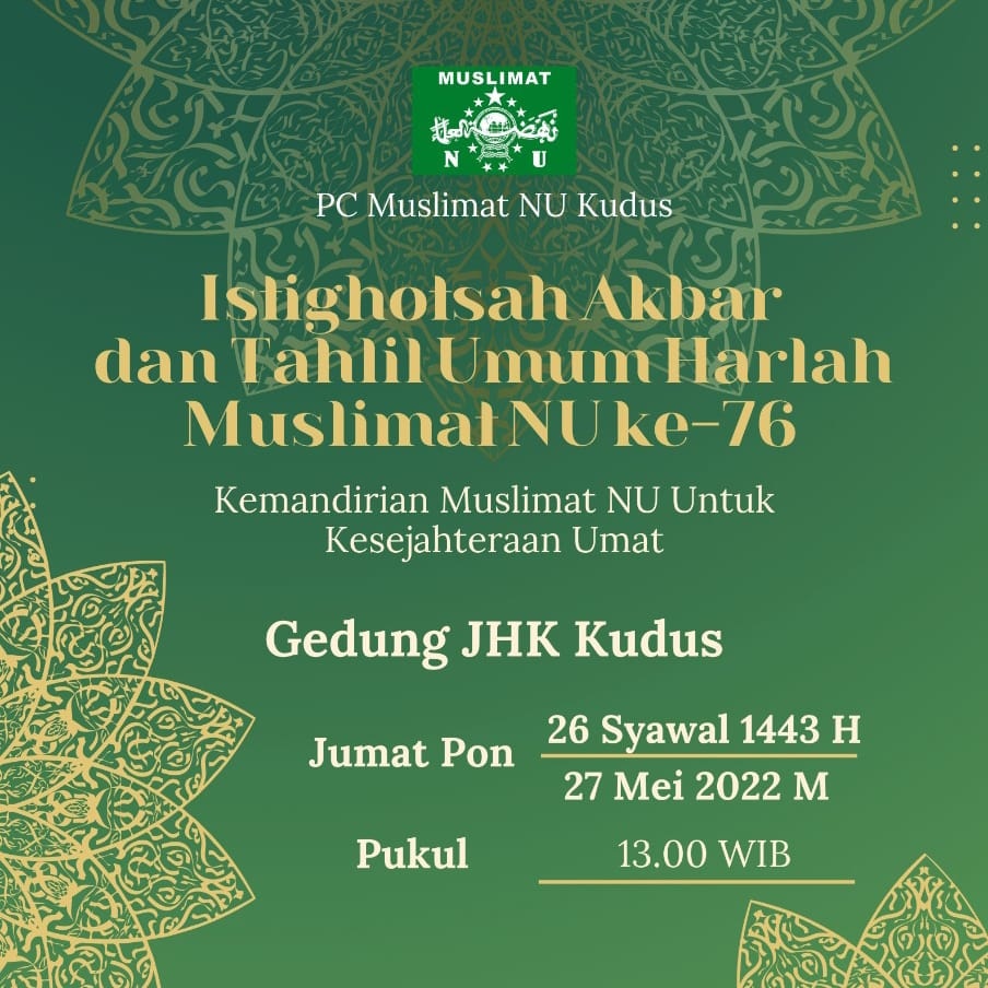 KUDUS,Suaranahdliyin.com – Pimpinan Cabang (PC) Muslimat NU Kabupaten Kudus bakal mengadakan Istighotsah dan Tahlil umum pada Jum’at 27 Mei 2022. Kegiatan dalam rangka Hari Lahir (harlah) ke-76 Muslimat ini akan berlangsung mulai pukul 13.00 WIB di Gedung JHK Kudus.