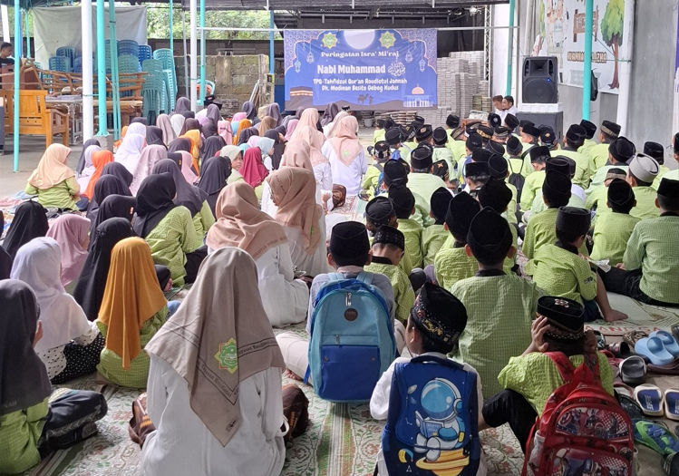 Peringatan Isra Mikraj yang diikuti oleh santri/ santriyah, ustaz/ ustazah hingga pengurus madrasah yang dilangsungkan di halaman TPQ Tahfidzul Qur’an Roudlotul Jannah ini, menghadirkan K Muhammad Mas’ad untuk menyampaikan tausiyah.