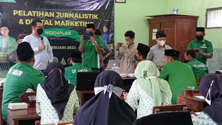 Merespons hal itu, Pimpinan Anak Cabang (PAC) GP Ansor Kecamatan Ngemplak, Boyolali menggelar pelatihan Jurnalistik dan Digital Marketing di MI Ma’arif Gagaksipat 1, Kanoman, Ahad (27/2/2022) lalu.