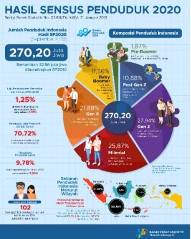 Dikutip dari Badan Pusat Statistik, hasil sensus penduduk (SP2020) pada September 2020 mencatat jumlah penduduk Indonesia sebesar 270,20 juta jiwa. Jika dibandingkan dengan hasil sensus penduduk 2010 terjadi penambahan yaitu bertambah 32,56 juta jiwa. Dari gambar tersebut akan terlihat bahwa generasi Millenial dan generasi Z menduduki dua posisi teratas dalam komposisi penduduk Indonesia. Sehingga dapat disimpulkan bahwa generasi mudalah yang mendominasi komposisi penduduk Indonesia. Bukan hanya dari segi kuantitas saja, namun dari segi kualitas generasi muda diharapkan mampu memberikan kontribusi yang lebih untuk kemajuan bangsa.