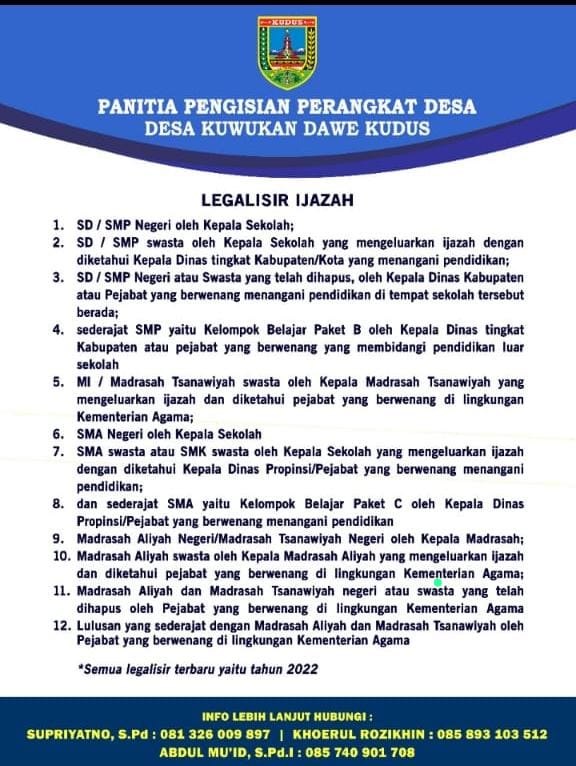 KUDUS,Suaranahdliyin.com – Pimpinan Cabang (PC) Gerakan Pemuda Ansor Kudus menyoroti persyaratan pendaftaran calon perangkat desa di kota kretek. Ansor menilai ada ketidakadilan pada persyaratan administrasi terkait legalisir ijazah.calon.