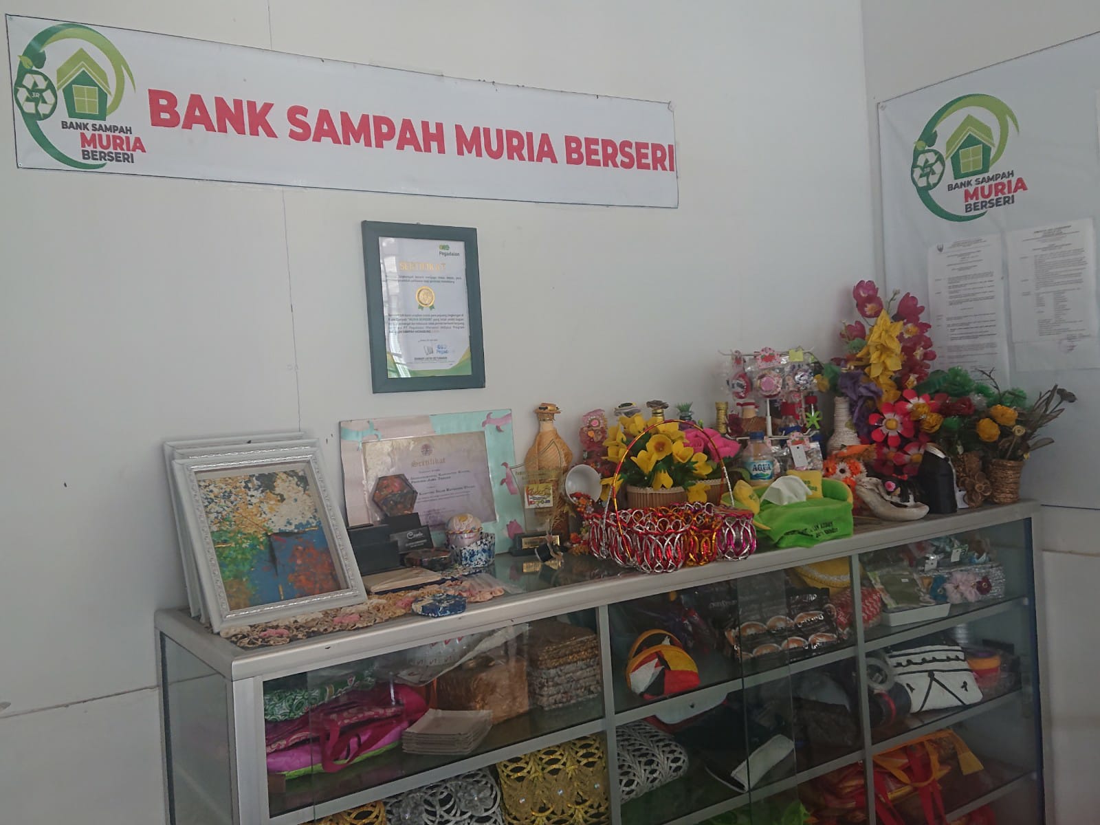 Tak hanya ditabung menjadi emas, Bank Sampah Muria Berseri juga mengelola sampah-sampah yang dikumpulkan menjadi barang kreasi dan barang layak jual. Berbagai kerajinan tangan dari tutup botol, botol minuman, sampah plastik disulap menjadi pernak-pernik yang cantik dengan berbagai bentuk.