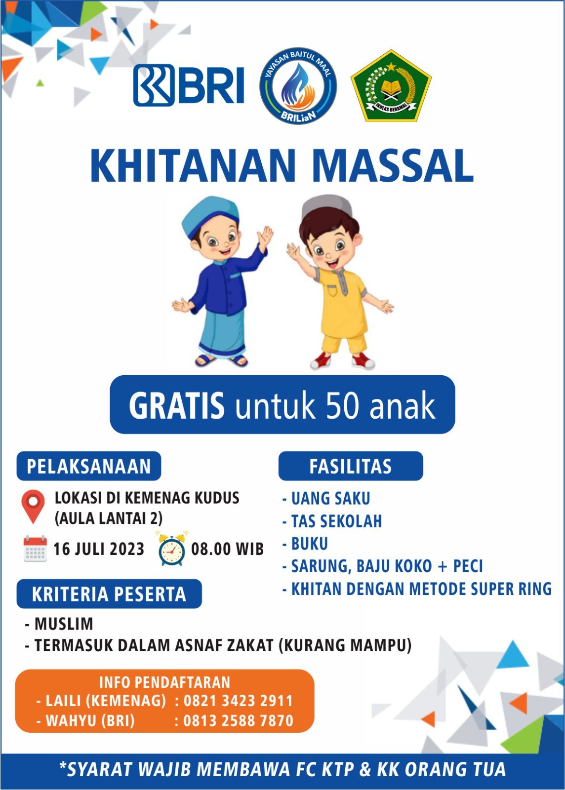 Khitanan massal dengan kuota sebanyak 50 anak ini, diperuntukkan bagi anak yang termasuk asnaf zakat (yang kurang mampu). Selengkapnya terkait informasi tersebut bisa menghubungi panitia di 082134232911 (Laili/ Kemenag) atau 081325887870 (Wahyu/ BRI). (rls/ ros, adb)