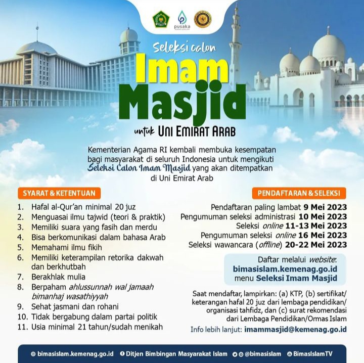 JAKARTA, Suaranahdliyin.com – Kementerian Agama (Kemenag) RI membuka kesempatan bagi masyarakat Indonesia mengikuti seleksi imam masjid, yang akan ditempatkan di masjid-masjid di Uni Emirat Arab (UEA).