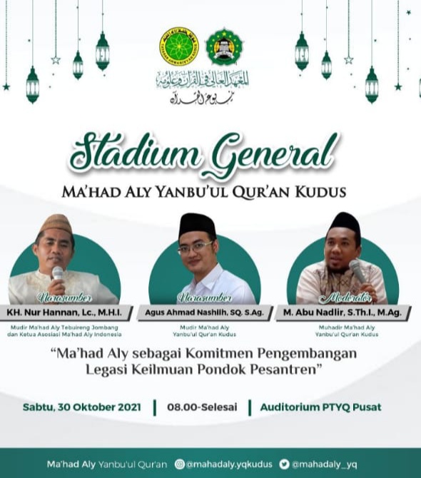 KUDUS, Suaranahdliyin.com – Ma’had Aly Yanbu’ul Qur’an Kudus, akan menyelenggarakan kuliah umum (stadium general) bagi para mahasantrinya, pada Sabtu (30/10/2021) mendatang.