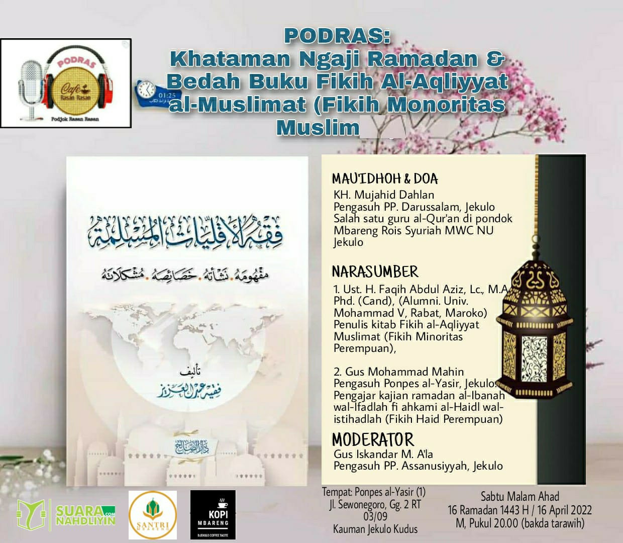 KUDUS, Suaranahdliyin.com – Podjok Rasan-rasan (Podras) akan menyelenggarakan khataman Ngaji Ramadan dan bedah buku Fikih Al-Aqliyyat al-Muslimat (Fikih Minoritas Perempuan) pada Sabtu (16/4/2022) malam mulai pukul 20.00 WIB (Bakda Tarawih).