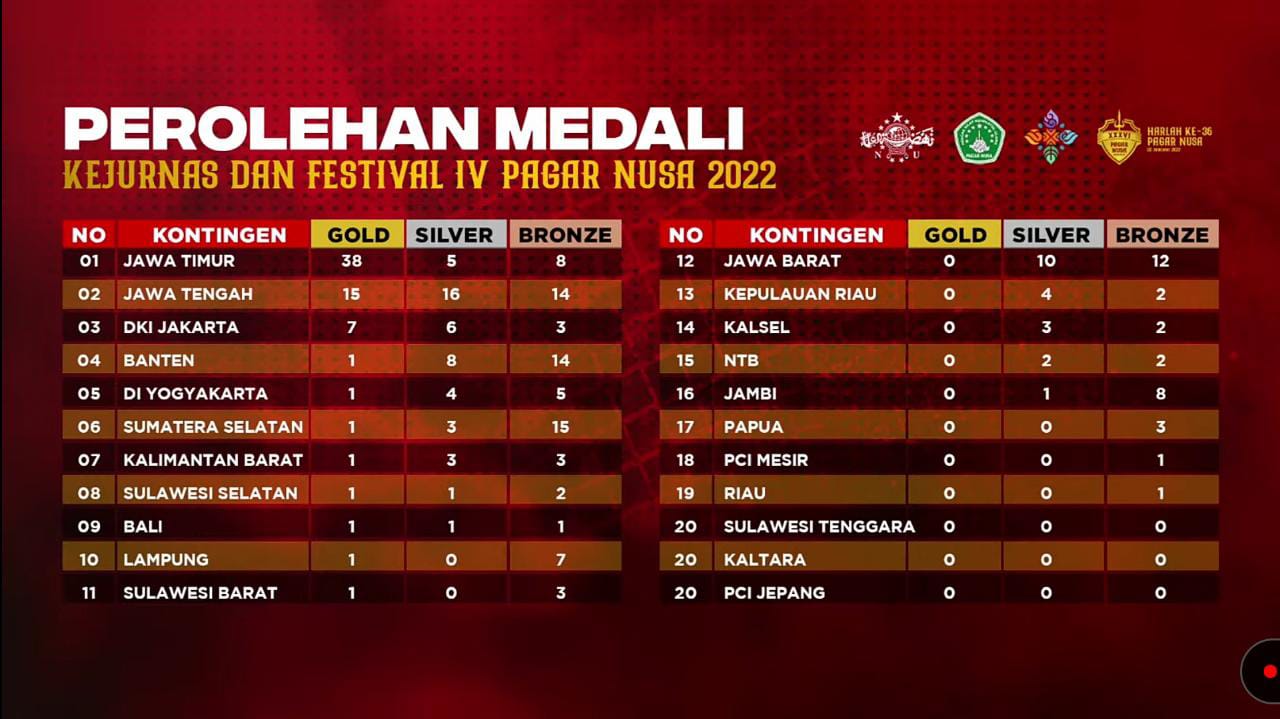 Juara Umum Kejurnas Pagar Nusa IV kali ini diraih oleh kontingen Pagar Nusa Jawa Timur dengan perolehan medali gold 38, silver 5 dan bronze 8. Sedangkan kontingen Pagar Nusa Jawa Tengah sendiri berhasil menyabet juara kedua setelah timnya menoreh gold 15, silver 16 dan bronze 14.