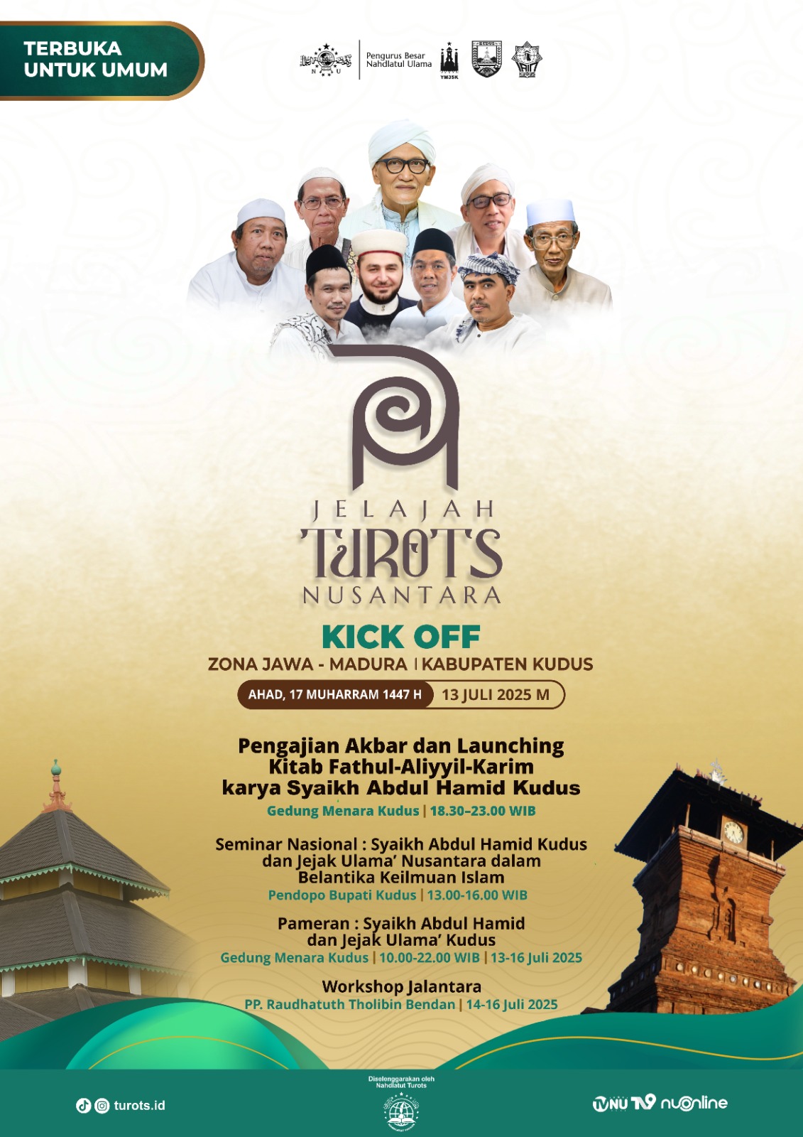 KUDUS, Suaranahdliyin.com – Kabupaten Kudus menjadi tuan rumah gelaran “Jelajah Turots Nusantara” untuk Zona Jawa dan Madura. Kick off Jelajah Turots Nusantara di Kudus ini akan dilangsungkan pada Ahad, 13 Juli 2025 M/ 17 Muharram 1447 H.