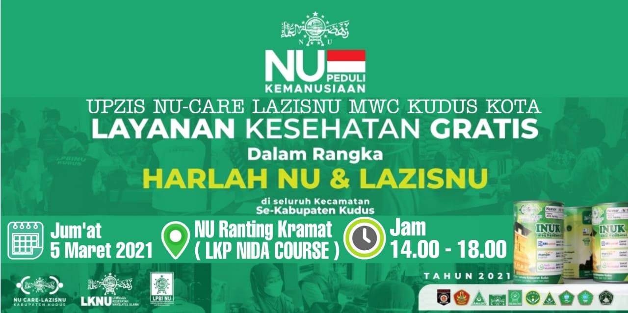 KUDUS, Suaranahdliyin.com – Dalam rangka memeringati Hari Lahir (Harlah) Nahdlatul Ulama dan Lembaga Amil Zakat Infak dan Shadaqah (LAZISNU), MWC NU Kecamatan Kot a bersama UPZIS akan menyelenggarakan layanan kesehatan gratis.