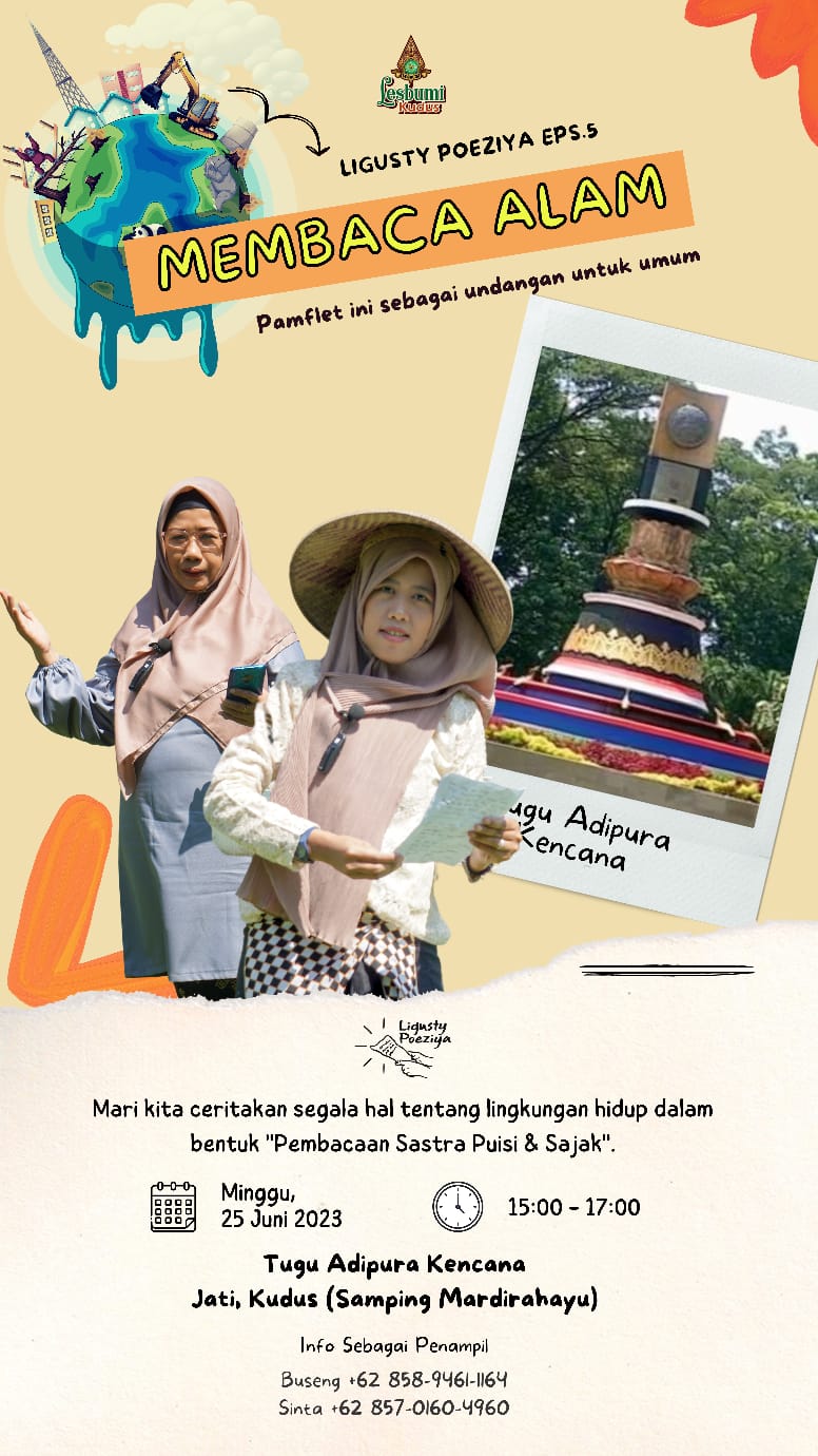 KUDUS,Suaranahdliyin.com – Dalam rangka memeringati hari lingkungan hidup se-dunia, Lembaga Seniman dan Budayawan Muslimin Indonesia (Lesbumi) Kudus akan kembali menggelar kegiatan bertajuk Ligusty Poeziya Ahad (24/6/2023). Kali ini, sejumlah seniman bakal berpuisi bertema membaca alam di Tugu Adipura Desa Jati Wetan Kudus.