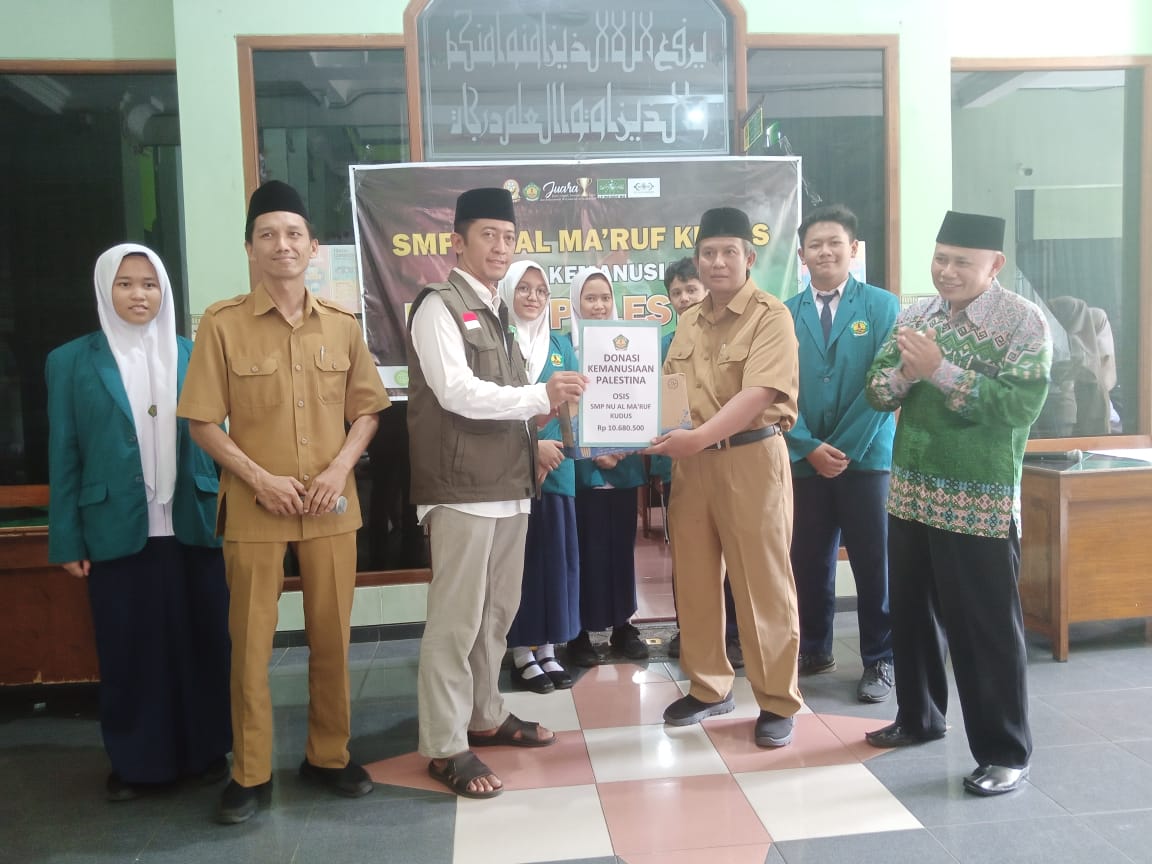 KUDUS, Suaranahdliyin.com – Keluarga besar SMPNU Al-Ma’ruf Kudus menyalurkan donasi peduli Palestina sebesar Rp.10.680.500, -Donasi yang terkumpul dari para guru, peserta didik dan karyawan SMPNU Al-Ma’ruf itu diserahkan melalui NU Care – LAZISNU Kudus, Senin (6/10/2023).