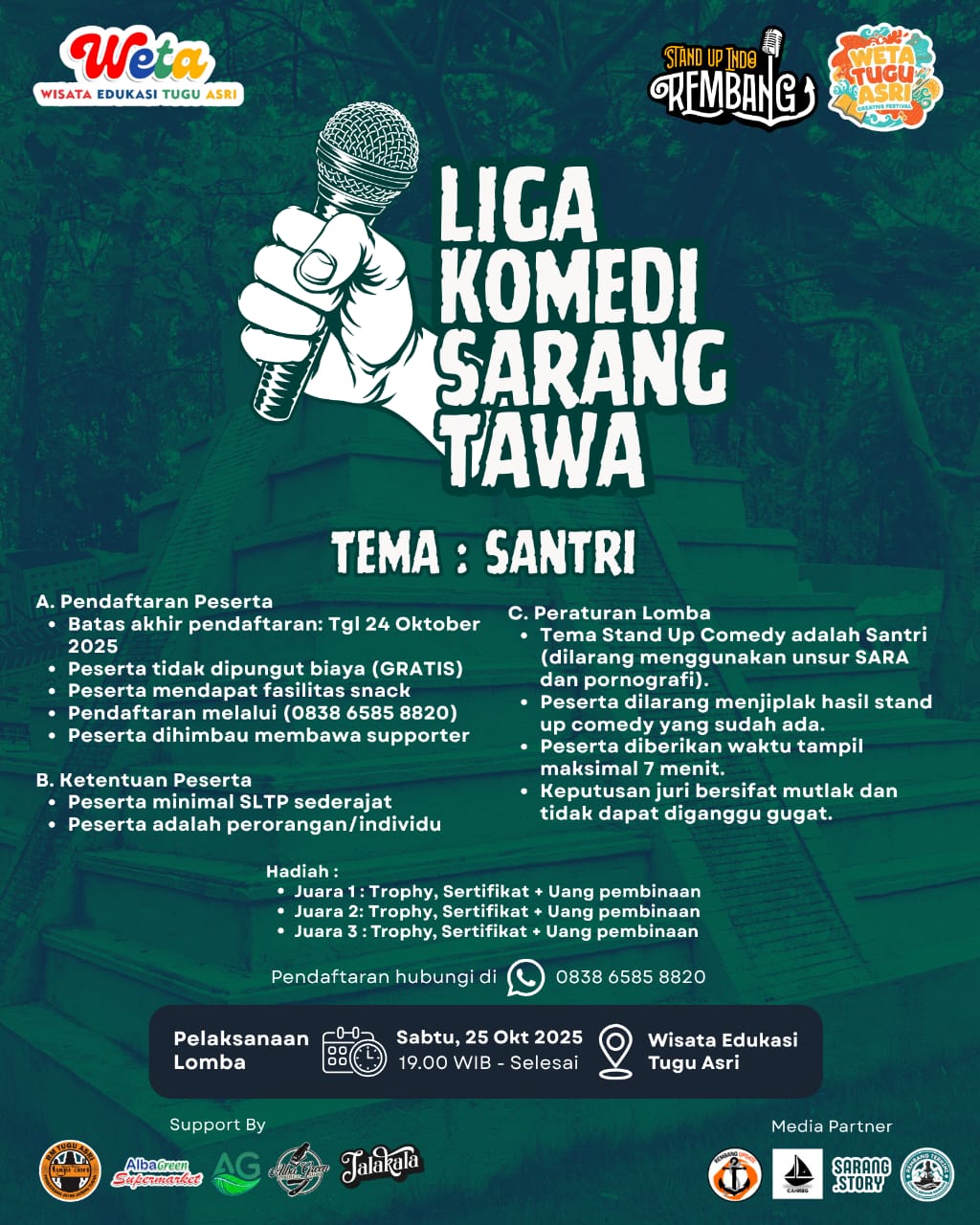 REMBANG, Suaranahdliyin.com – Dunia komedi tanah air akan semakin berwarna dengan hadirnya “Liga Komedi Sarang Tawa”, ajang stand up comedy bertajuk “Santri” yang akan digelar di Wisata Edukasi Tugu Asri (Weta), Sabtu (25/10/2025) malam mulai pukul 19.00 WIB.