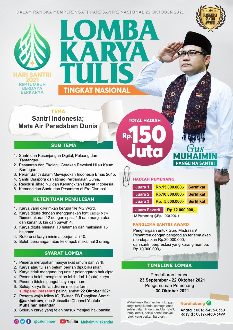 JAKARTA, Suaranahdliyin.com – Dalam rangka memeringati dan menyemarakkan Hari Santri 2021, “Panglima Santri Award” menggelar Lomba Karya Tulis (LKT) dengan total hadiah sebesar Rp 150 juta.