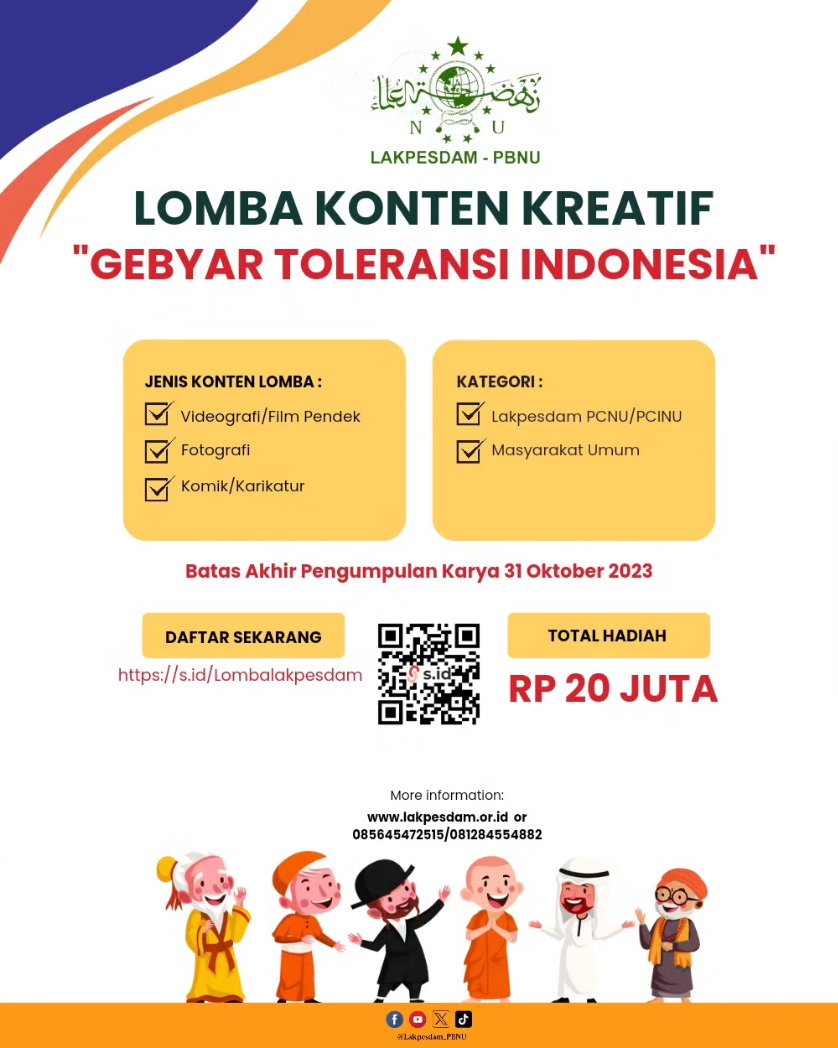 Bagi siapa saja yang memiliki kreativitas dan terarik, bisa mengirimkan karya terbaiknya dalam bentuk video atau film pendek, fotografi, dan juga komik/ karikatur dengan topik “Toleransi”. Panitia menyiapkan hadiah sebesar Rp 20 Juta dalam lomba ini. Buruan, ya. Jangan sampai kelewatan. (rls/ ros, adb)