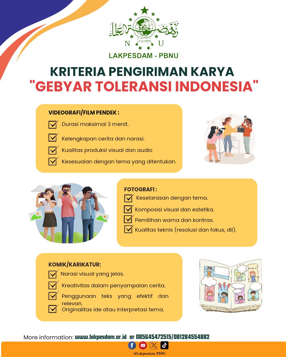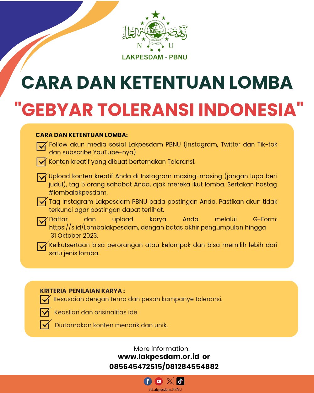 JAKARTA, Suaranahdliyin.com – Lakpesdam PBNU menyelenggarakan Lomba Konten Kreatif. Dikutip Suaranahdliyin.com dari akun twitter @Lakpesdam_PBNU, lomba tersebut mengusung tema “Gebyar Toleransi Indonesia”.