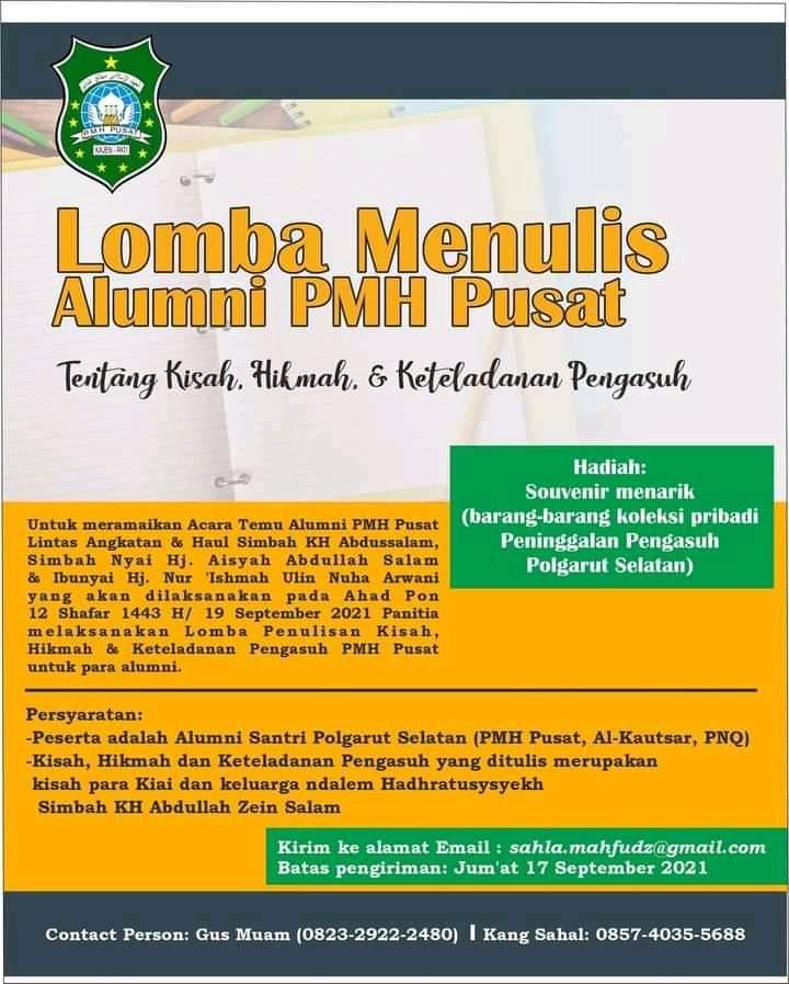 PATI, Suaranahdliyin.com – Untuk meramaikan temu alumni Pondok Maslakul Huda (PMH) Pusat lintas angkatan dan haul masyayikh, digelar lomba menulis bagi alumni PMH tentang “Kisah, Hikmah dan Keteladanan Pengasuh”.
