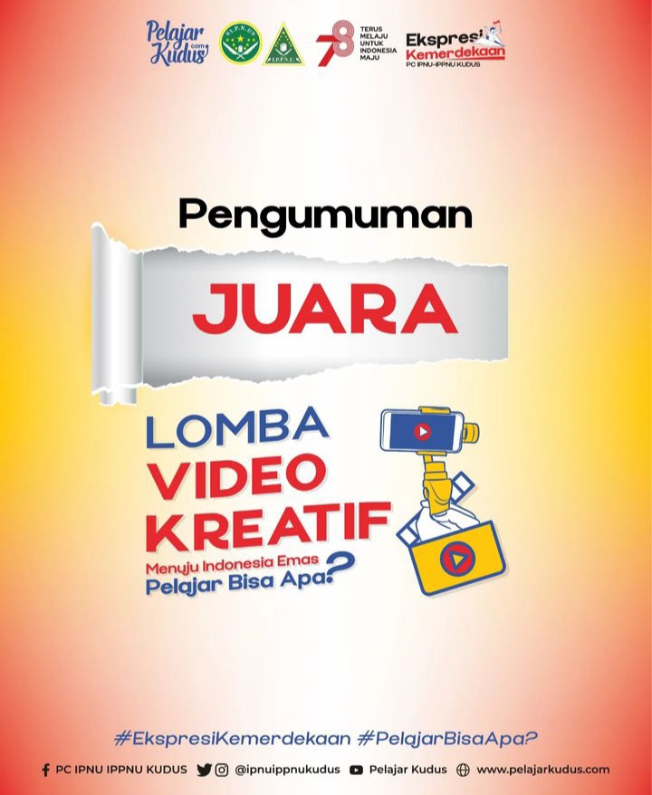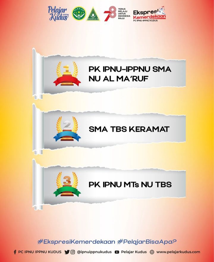 Dikutip Suaranahdliyin.com dari akun Instagram (IG) @ipnuippnukudus, Rabu (30/8/2023), lomba ekspresi kemerdekaan tersebut mengusung tema “Menuju Indonesia Emas: Pelajar Bisa Apa?”