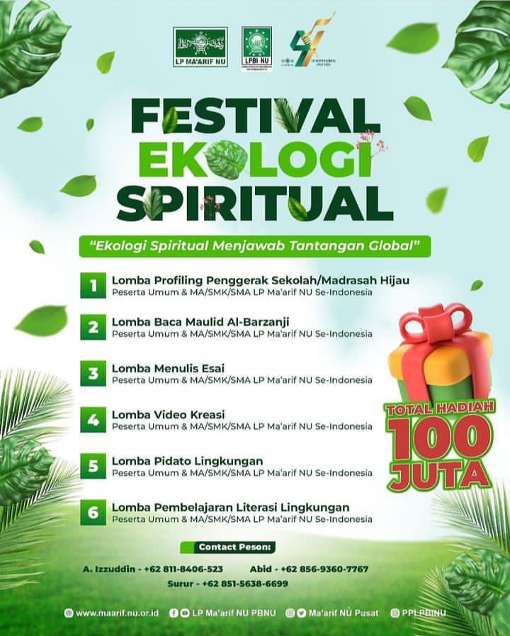 JAKARTA, Suaranahdliyin.com – LP Ma’arif dan LPBI NU, akan menggelar Festival Ekologi Spiritual”, dengan tema “Ekologi Spiritual Menjawab Tantangan Global”.