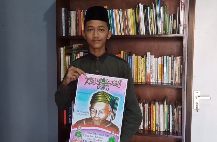 Alan, sapaan akrabnya, membuat desain poster dengan tema “Aku Cinta NU”. Ia menggambar sosok KH Hasyim Asy’ari yang tak lain adalah tokoh pendiri NU.