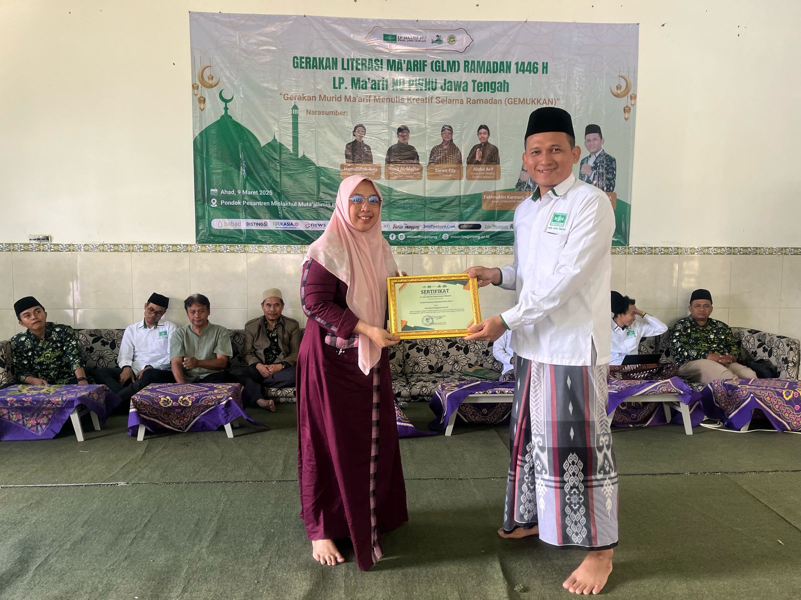 Di akhir pembukaan, kegiatan dilanjutkan dengan penyerahan sertifikat penghargaan sebagai Pesantren Penggerak dari LP. Ma’arif NU PWNU Jawa Tengah yang diwakili Sekretaris LP. Ma’arif NU PWNU Jawa Tengah Dr. M. Ahsanul Husna kepada Pondok Pesantren Mislakhul Muta’allimin Warungpring Pemalang yang diwakili oleh pengasuh Hj. Faizatul Khoriyah, M.Pd. Penghargaan itu diberikan dalam rangkaian kegiatan GLM Ramadan dan menjadi motivasi untuk menggerakkan literasi di bawah naungan pesantren dan lembaga pendidikan di bawahnya.