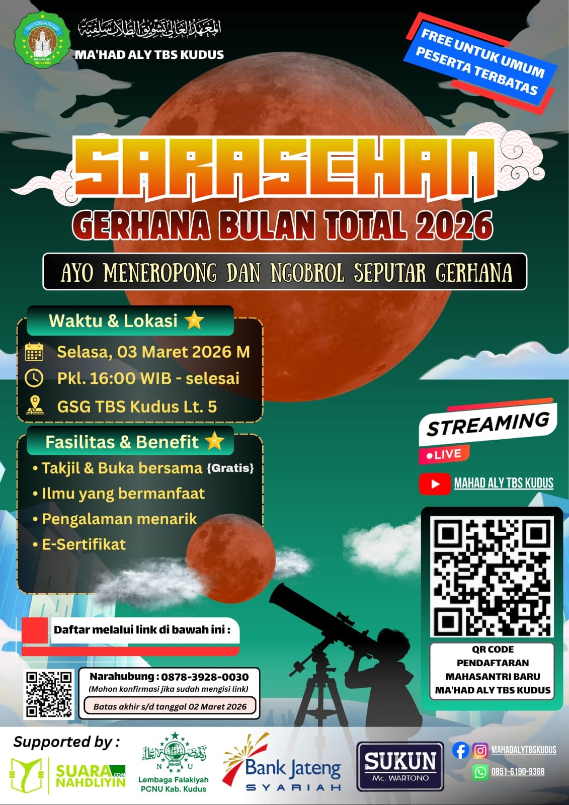 Terkait dengan akan adanya gerhana bulan total tersebut, Ma’had Ay TBS Kudus mengagendakan meneropong gerhana bulan total yang dirangkai dengan sarasehan.