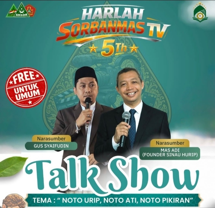 “Tasyakuran Harlah Sorbanmas TV kami kemas dengan acara talk Show yang menghadirkan narasumber sumber Gus Syaifudin (LDNU Kudus) dan Founder Sinau Hurip Mas Adi,”ujar ketua panitia Adi Risma Widaya dalam rilis undangan yang diterima Suaranahdliyin.com, kemarin.