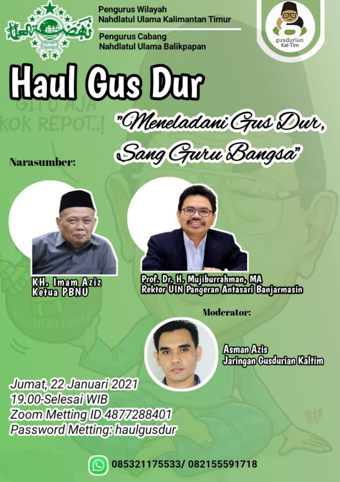 Mengusung tema “Meneladani Gus Dur, Sang Guru Bangsa”, webinar mendaulat KH Imam Aziz (Ketua PBNU) dan Prof Dr H Mujiburrahman MA (Rektor UIN Pangeran Antasari, Banjarmasin) sebagai narasumber. Webinar akan dipandu Asman Aziz (Jaringan GusDurian Kalimantan Timur). (ros/ adb)